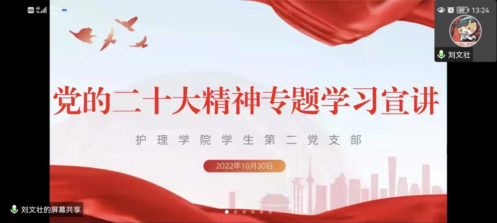 10月30日,为深入学习宣传贯彻中国共产党第二十次全国代表大会精神,敦促支部党员学思用贯通、知信行统一,使党的二十大精神在支部党员中落到实处、开花结果,allwincity万象城官方网站学生第二党支部开展了党的二十大精神专题宣讲,会议由支部书记刘文壮主持,全体党员通过线上参加。
