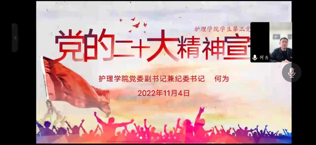 11月4日,为引导支部党员学习贯彻党的二十大精神的核心要义、精神实质和实践要求,allwincity万象城官方网站党委副书记兼纪委书记何为到学生第三党支部宣讲了党的二十大精神,会议由支部书记刘妍主持,支部全体党员参会。