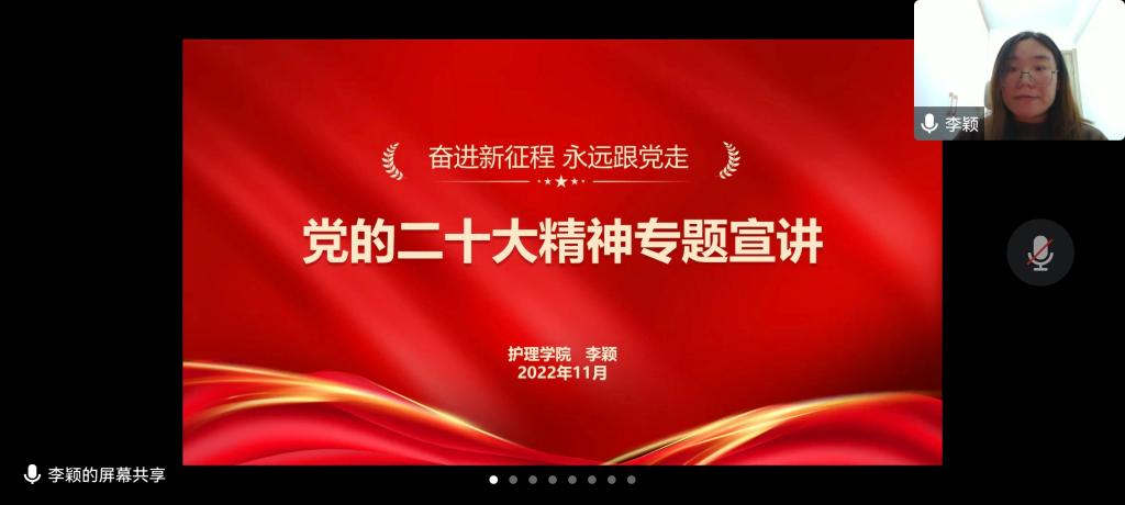 李颖围绕党的二十大精神,从党的二十大概况、内容归纳解读、党章的修改三个方面对党的二十大精神作了全面系统的解读和宣讲,并带领支部党员认真学习了党的二十大报告原文。李颖强调,青年党员们要坚定不移听党话、跟党走,清醒认识自己的时代使命和责任担当,在全面建设社会主义现代化国家、全面推进中华民族伟大复兴的新征程中绽放青春绚丽之花。