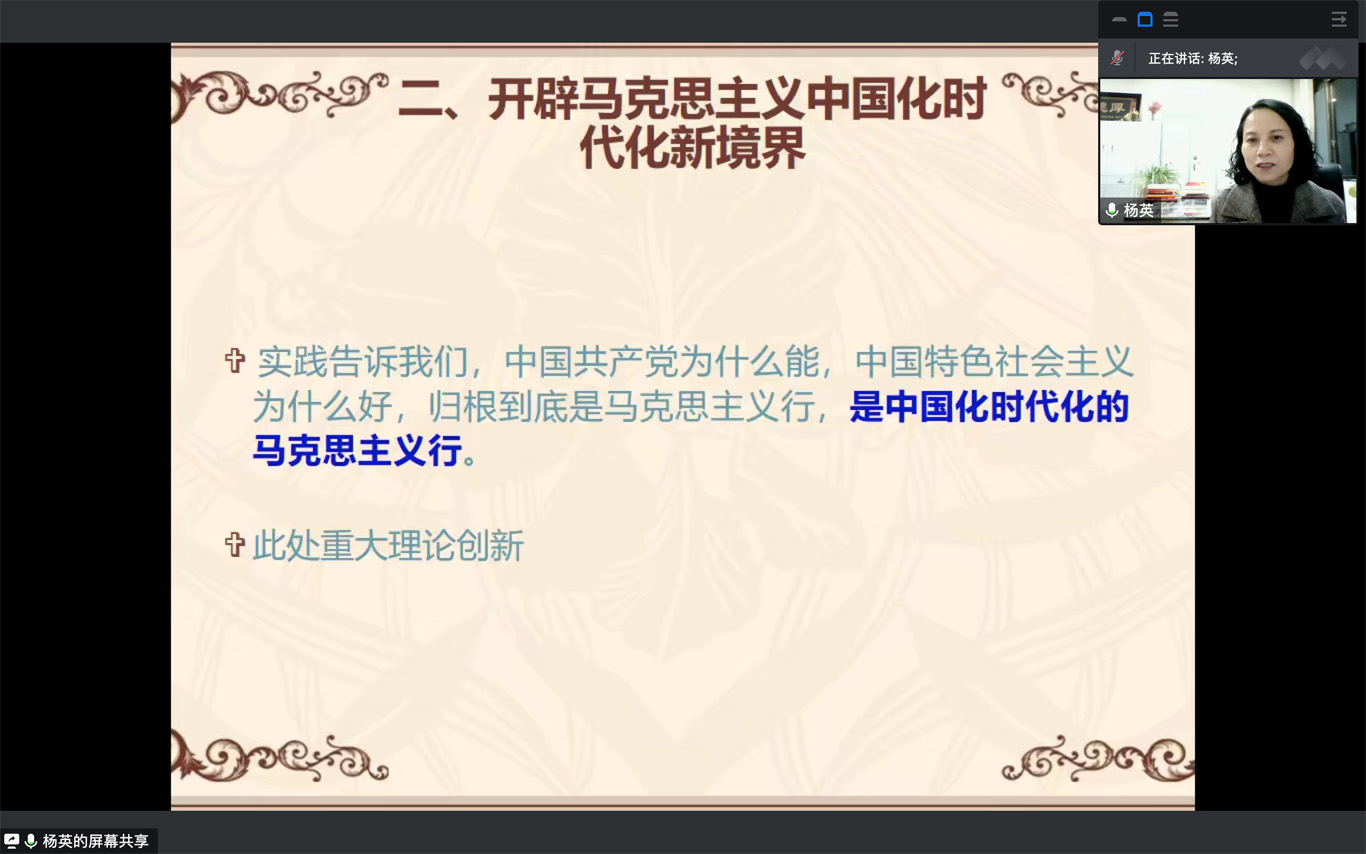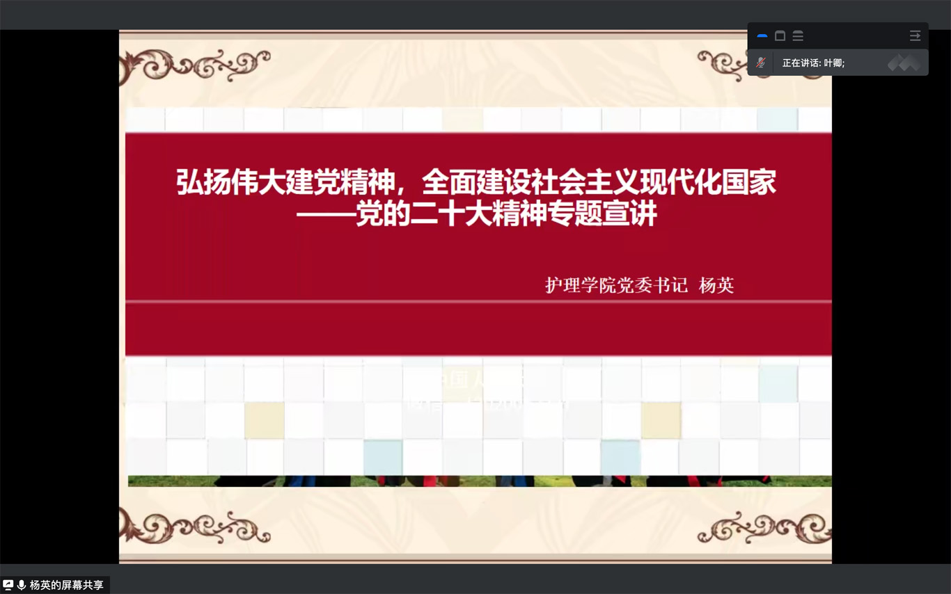 12月10日,为深入学习贯彻党的二十大精神,引导学生党员认真学习,领悟精神实质,allwincity万象城官方网站党委书记杨英以“弘扬伟大建党精神,全面建设社会主义现代化国家”为主题在allwincity万象城官方网站学生第一党支部宣讲党的二十大精神,会议由支部书记杨叶卿主持,全体支部党员、 入党积极分子通过腾讯会议参加本次宣讲。