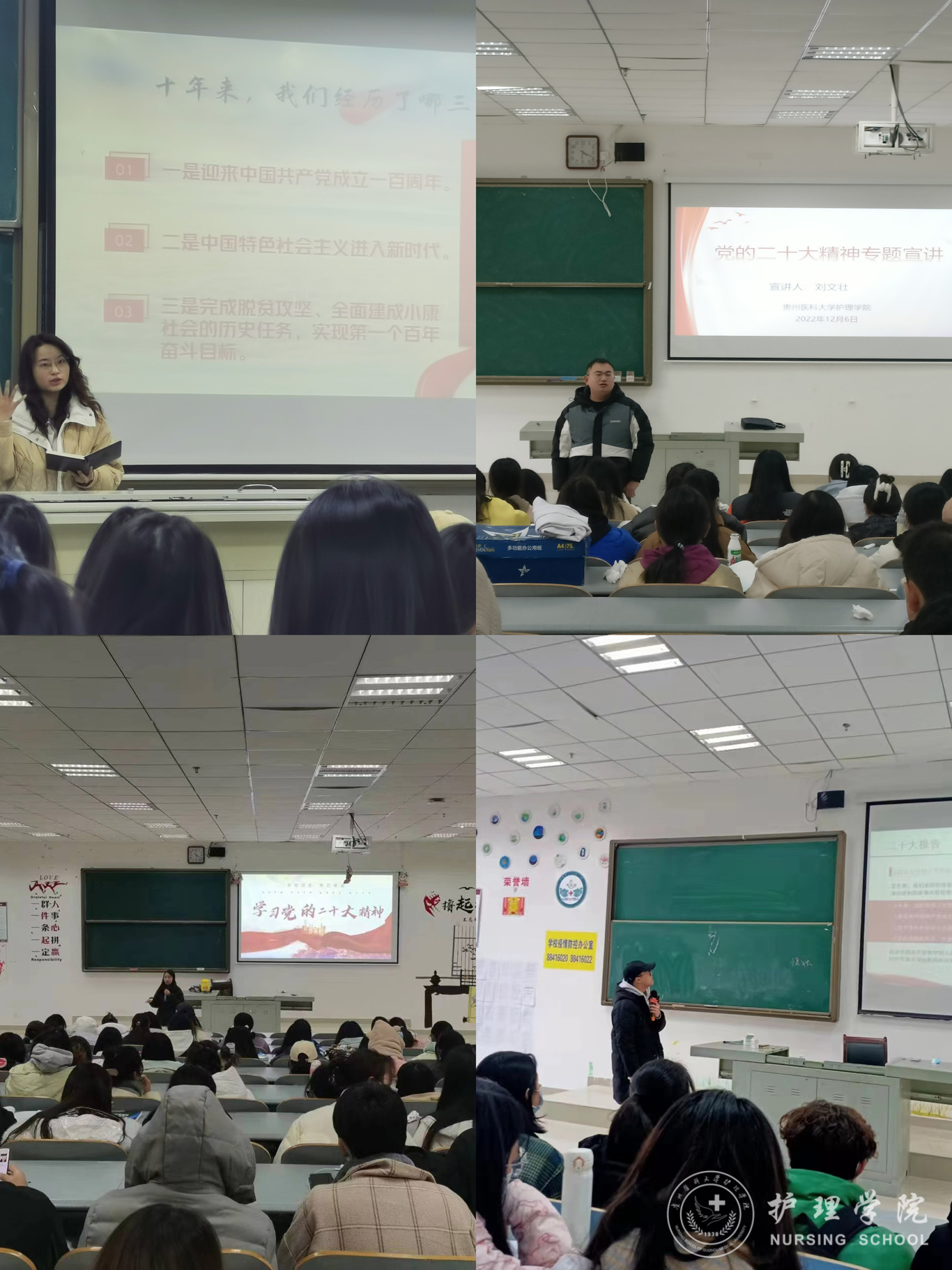 首先,各班辅导员带领班级同学学习了党的二十大报告,围绕党的二十大精神,从党的二十大的意义、概况、内容以及党章的修改等几个方面对党的二十大精神作了全面系统的解读和宣讲。接下来,辅导员带领大家回顾了从党的十九大以来的五年工作和新时代十年的伟大变革,号召大家要居安思危,常怀远虑,坚定不移听党话、跟党走,坚守初心使命,怀抱梦想,脚踏实地,立志做有理想、敢担当、能吃苦、肯奋斗的新时代好青年。