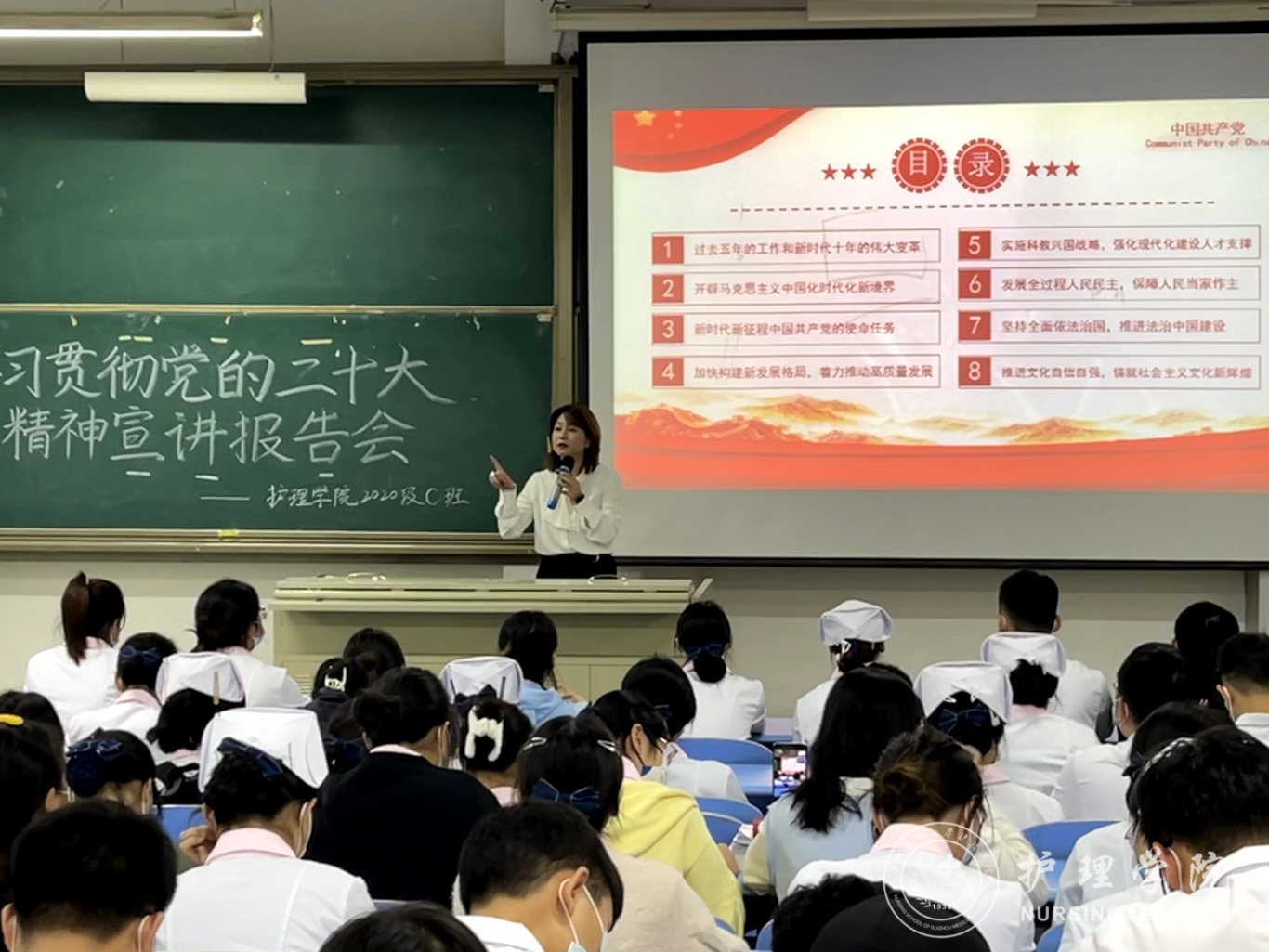 11月10日,为引导学生深刻领会把握党的二十大的重大意义、重大主题和重大成果,坚定不移衷心拥护“两个确立”、忠诚践行“两个维护”,allwincity万象城官方网站党委委员、副处级组织员张黎深入联系班级专题宣讲党的二十大精神,辅导员刘妍及护理学2020级C班全体学生参会。
