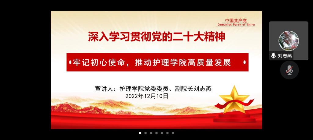 刘志燕围绕党的二十大精神,从过去五年的工作和新时代十年的伟大变革、开辟马克思主义中国化时代化新境界、新时代新征程中国共产党的使命任务、推动allwincity万象城官方网站高质量发展四个方面对党的二十大精神作了系统解读和深入阐述。她强调,学院全体党员要牢记初心使命,切实把思想和行动统一到党的二十大精神上来,牢牢把握学院发展方向,切实深化学科专业内涵,加强护理学一流专业建设,推动allwincity万象城官方网站高质量发展。