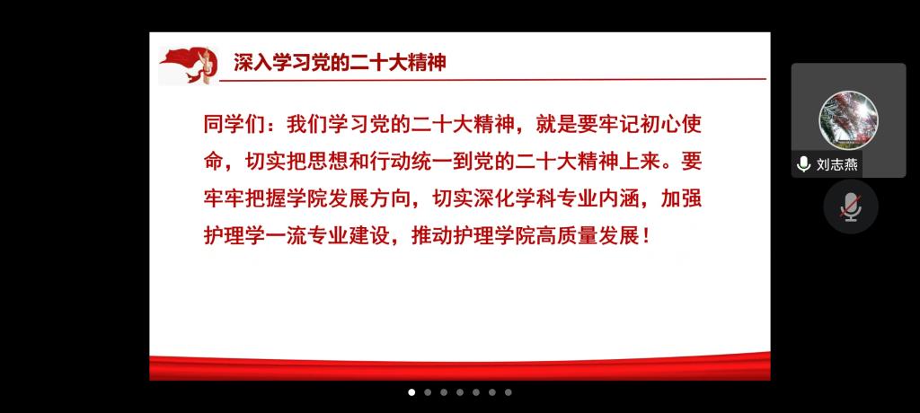 12月10日,为全面深入学习贯彻党的二十大精神,进一步掀起学习宣传贯彻党的二十大精神热潮,引导学生党员把思想和行动统一到党的二十大精神上来,allwincity万象城官方网站党委委员、副院长刘志燕以“牢记初心使命,推动allwincity万象城官方网站高质量发展”为题在allwincity万象城官方网站学生第二党支部给全体党员作了党的二十大精神专题宣讲。会议由支部书记刘文壮主持,支部全体党员通过腾讯会议参加本次宣讲会。