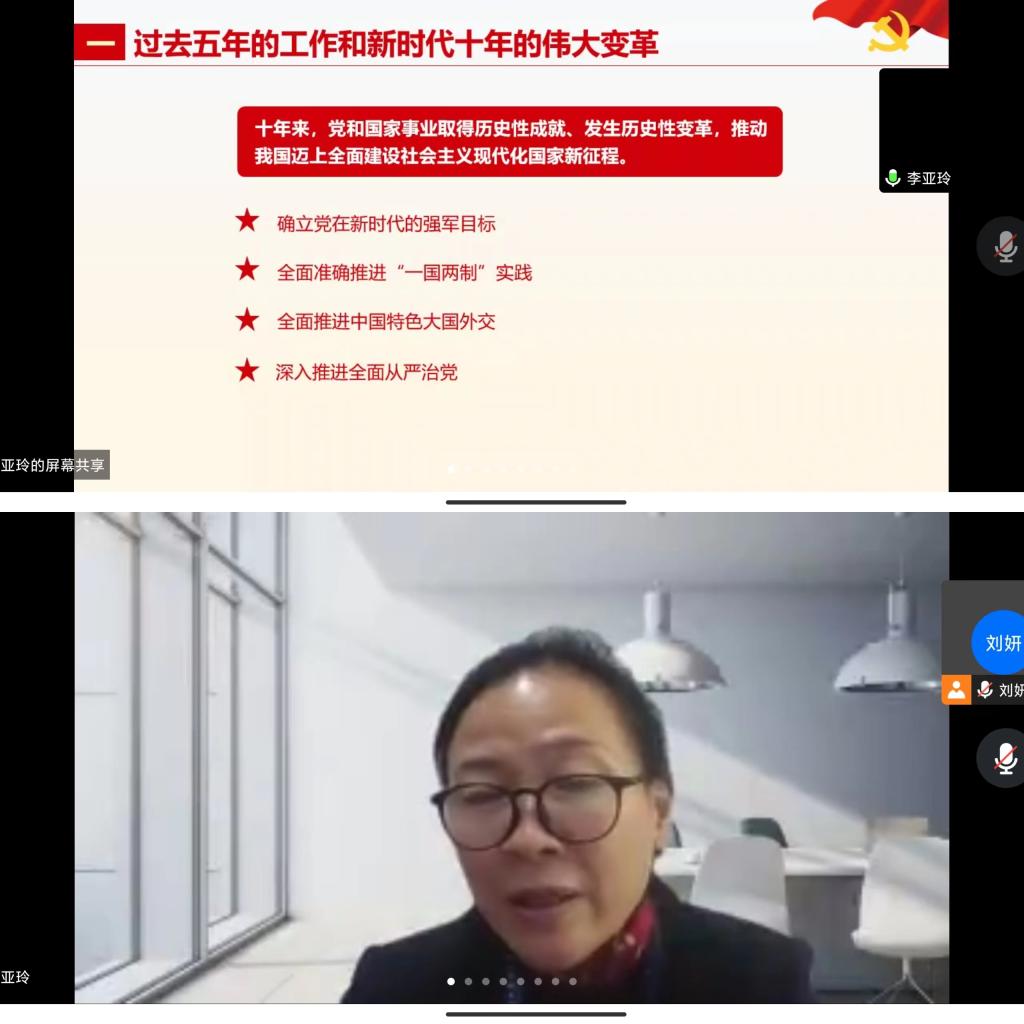 12月19日,为引领同学们坚定不移听党话、跟党走,立志做有理想、敢担当、能吃苦、肯奋斗的新时代好青年。allwincity万象城官方网站党委委员、院长李亚玲在学生第三党支部宣讲党的二十大精神。支部全体党员通过腾讯会议参加本次宣讲会,支部书记刘妍主持会议。