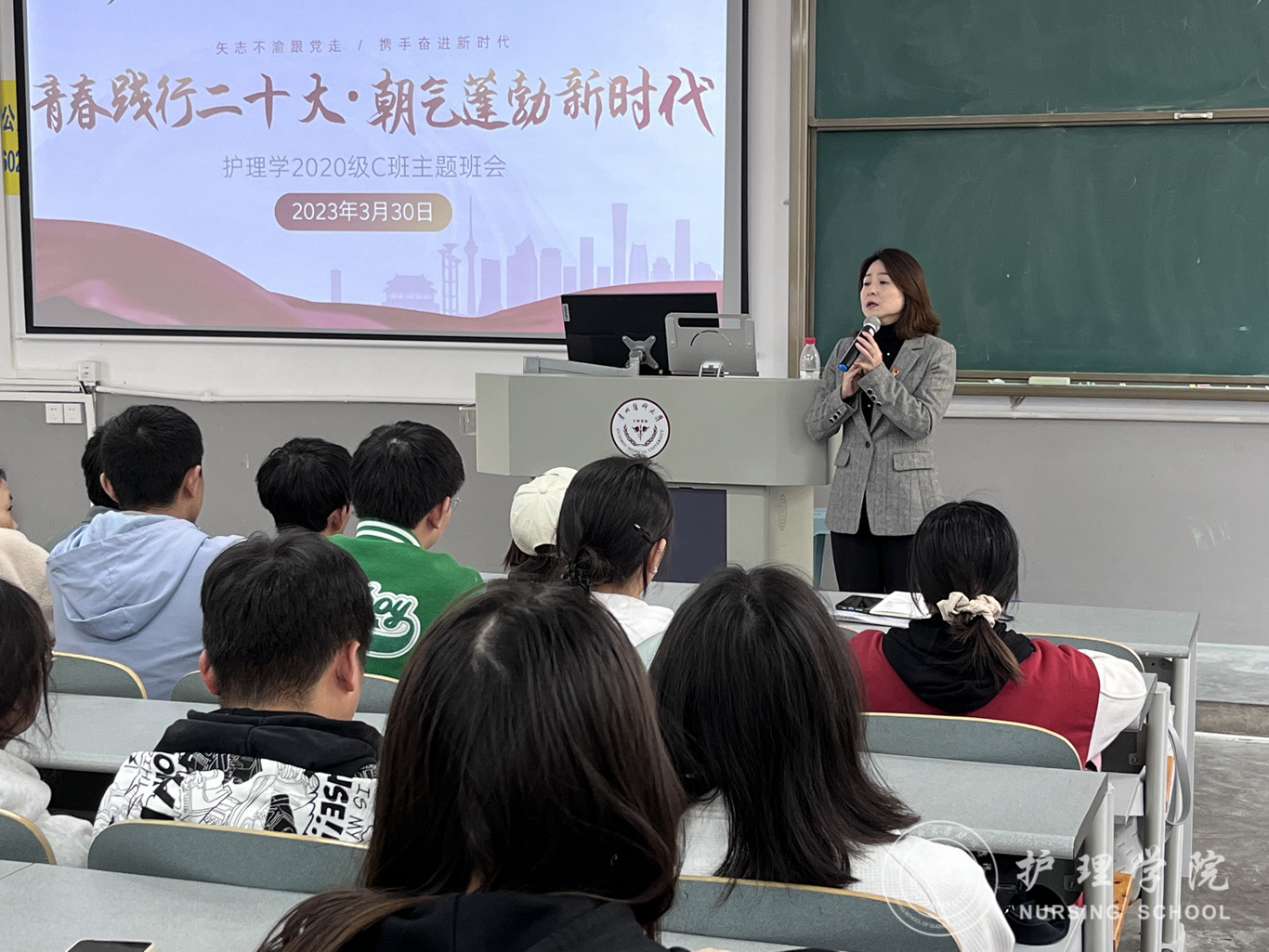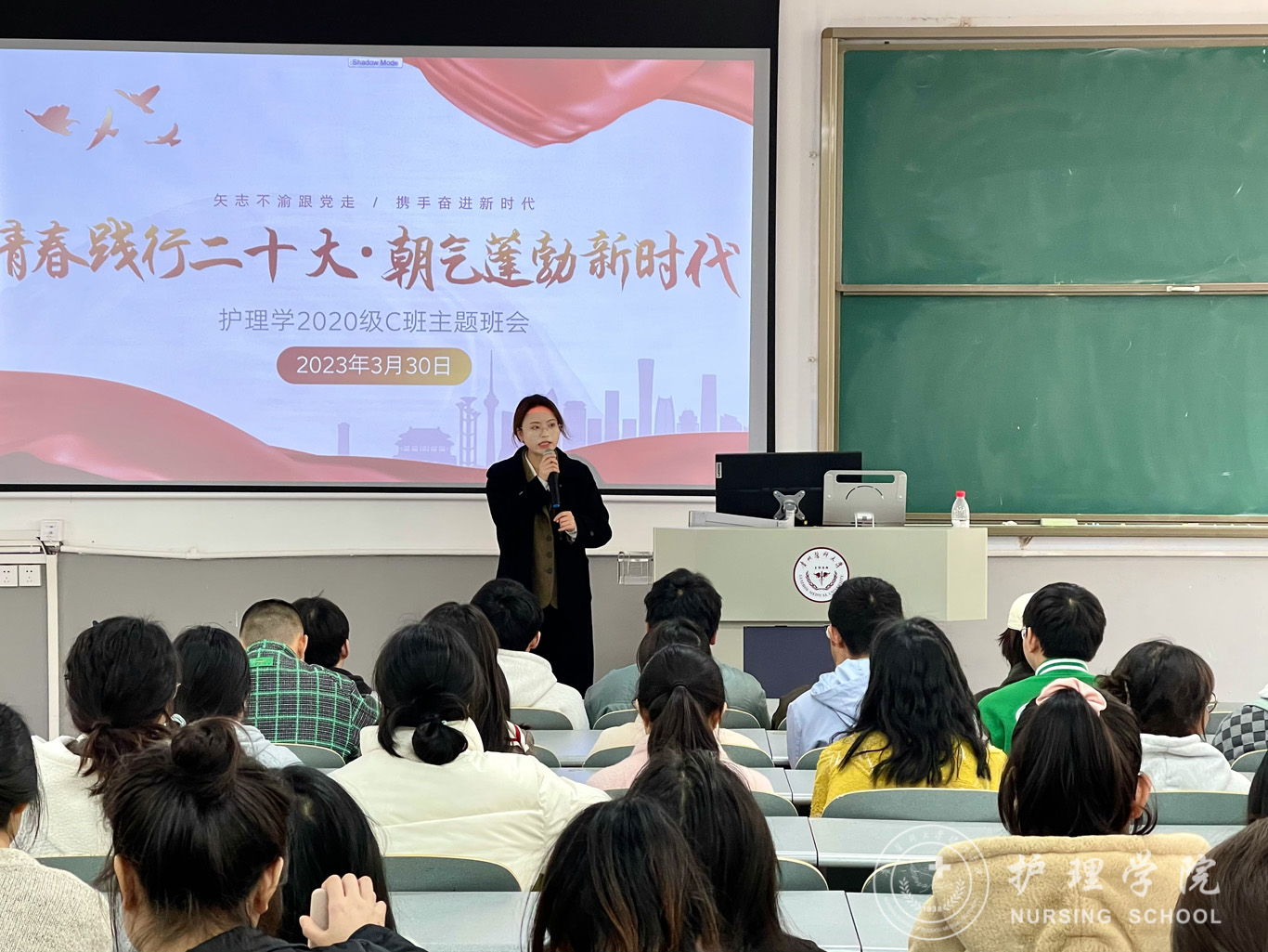 3月30日,为深入学习宣传贯彻党的二十大精神,强化思想引领,聚焦立德树人根本任务。allwincity万象城官方网站党委委员、副处级组织员张黎到护理学2020级C班开展了“青春践行二十大,朝气蓬勃新时代”主题班会活动,会议由辅导员刘妍主持,班级全体同学参与。