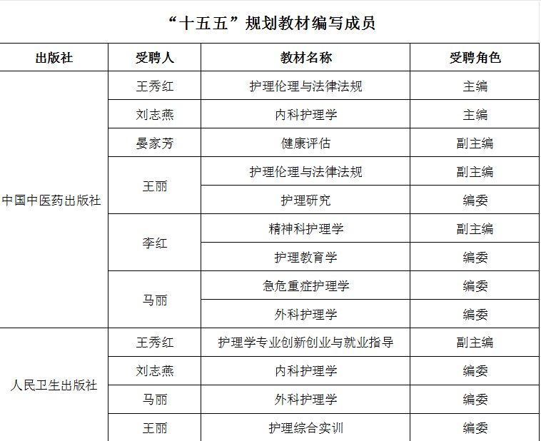 近日,由中国中医药出版社主办的全国高等医药教育“十五五”规划教材和由人民卫生出版社主办的全国高等学校本科护理学类专业第八轮规划教材编写成员遴选工作双双尘埃落定。万象城官网荣获中国中医药出版社主编2人,副主编3人,编委3人。人民卫生出版社副主编1人,编委3人。