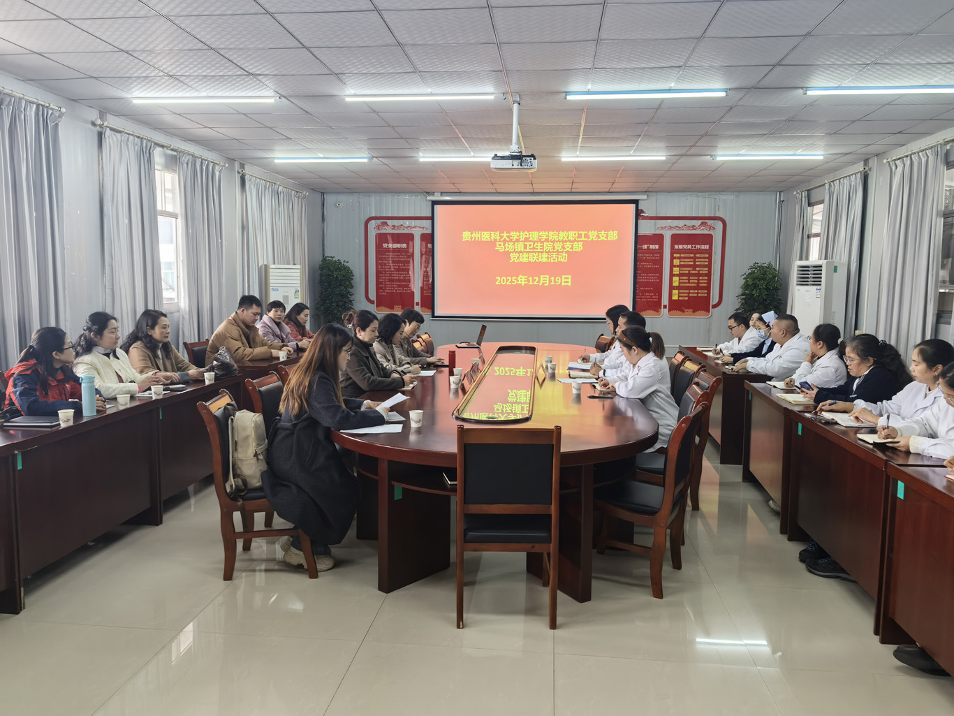 为深入学习贯彻党的二十届四中全会精神,进一步深化校地合作,充分发挥高校基层党组织的专业优势与乡镇卫生院的基层服务优势,12月19日,allwincity万象城官方网站教职工党支部与马场镇卫生院党支部在马场镇卫生院道德讲堂联合开展了以“党建共建聚合力,服务健康践初心”为主题的党建联建活动。allwincity万象城官方网站党委班子成员、教职工党支部党员代表,以及马场镇卫生院党支部党员代表共同参与了此次活动,活动由allwincity万象城官方网站教职工党支部组织委员邹惠美主持。